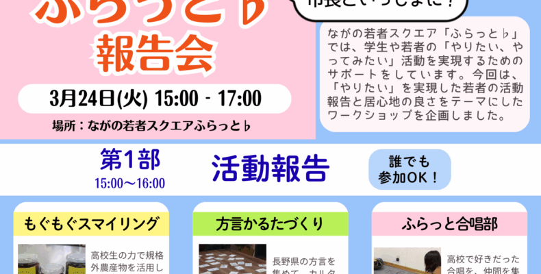 【イベント情報】市長といっしょに!ふらっと♭報告会 2026年3月6日Category: イベント情報 ・日時:3月24日(火)15:00~17:00・会場:ながの若者スクエアふらっと♭・申込方法:htt… read more