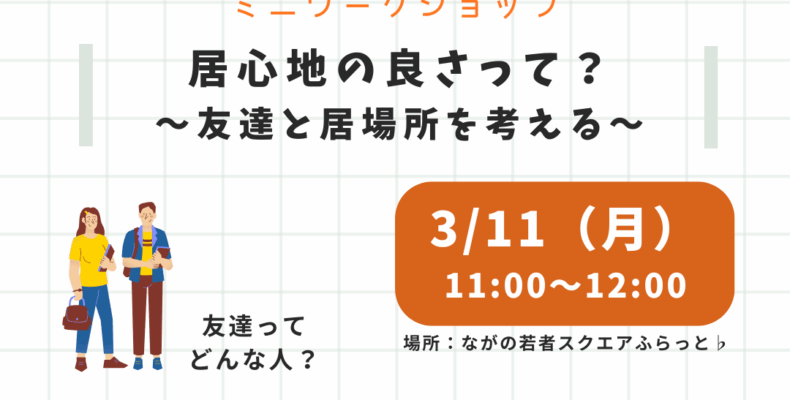 3月11日(水) 11:00~12:00に“居心地”について考えるワークショップを開催します! 友達…