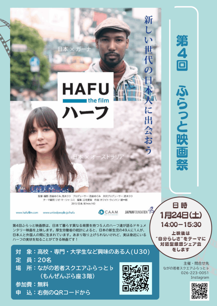 日本で暮らす異なる背景を持つ5人のハーフ達が語るドキュメンタリー映画を上映します。